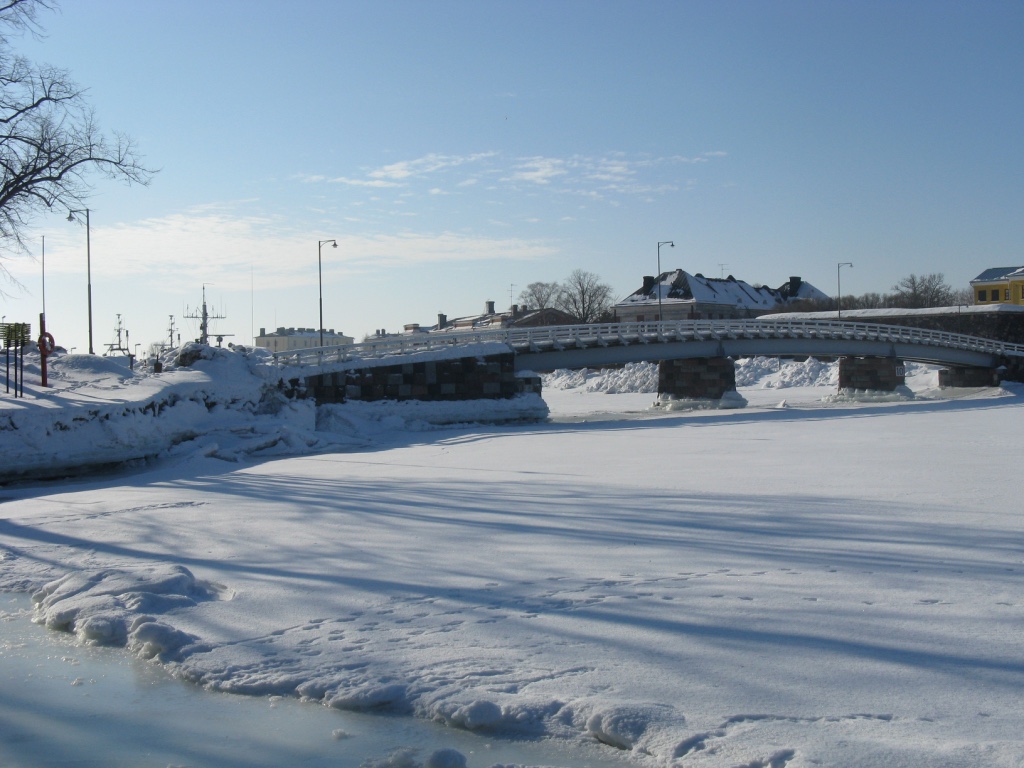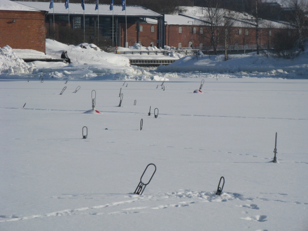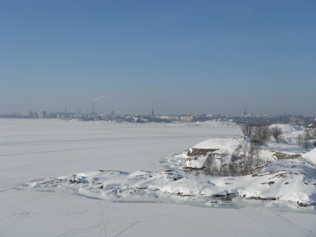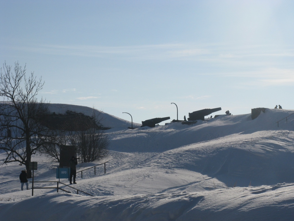 Une fois arrivée sur l’île, nous nous sommes promenés dans les rues enneigées. Malheureusement nous n’avons pas pu voir beaucoup de l’architecture des maisons et de la forteresse à cause du niveau de neige. Et en février l’attraction la plus impressionnante est de marcher sur la mer. En effet, la couche de glace et de neige est tellement épaisse qu’il est tout à fait possible de marcher sur la mer sans s’en rentre compte. C’est ce qui nous est arrivé. Nous marchions tranquillement sur cette étendue blanche jusqu’à ce que je m’aperçoive qu’à côté de moi il y avait des bouées d’amarrages pour les bateaux. C’est à ce moment là que nous avons réalisé où nous étions et c’était assez drôle. Des amis de Matthieu avaient amené un ballon de foot et ils ont ainsi joué au football sur la mer.