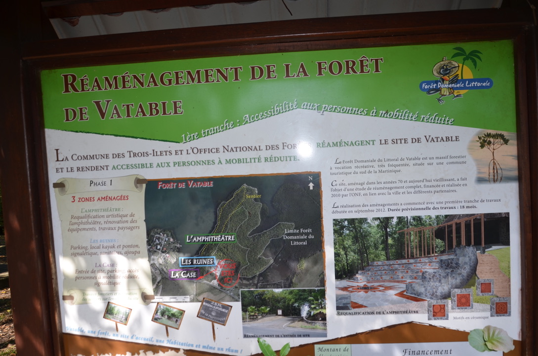 Situé à l’entrée de la commune des Trois-ilets la forêt de Vatable offre plusieurs circuits de marche pour petits et grands. Les sentiers sont bien entretenus et visibles. Il y a des tables de pique-nique et un large parking gratuit. La plus grande des randonnées vous amène jusqu’à la pointe de la forêt où il y a une très belle vue sur le gros îlet et la baie de Fort de France. Les sentiers passent par la mangrove et permettent de voir les palétuviers les pieds au sec. Il y a également beaucoup de petits crabes (les « c’est ma faute ») qui se promènent dans la mangrove. C’est une balade très agréable à l’abris de la chaleur.
