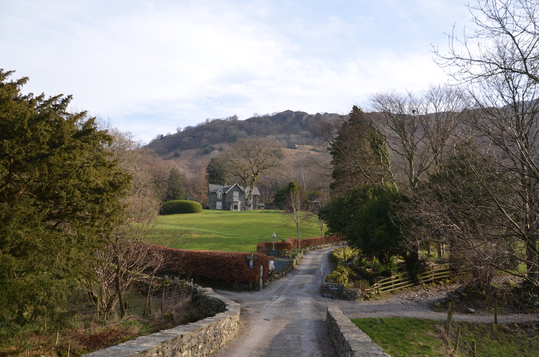 • Once at Watendlath (before the bridge to Watendlath) take the (public Bridleway) trail to Rosthwaite. Continue to descend following this path. At an intersection of signs, turn right (pass the gate) towards Rosthwaite. Continue straight to the parking.