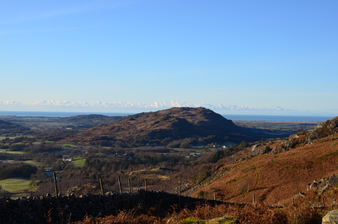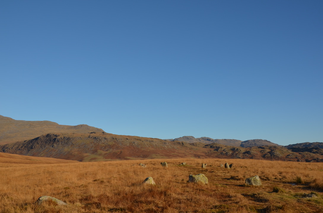 En ce 1er Décembre le soleil était parmi nous et la journée s’annonçait parfaite pour une randonnée. La veille nous étions allés marcher vers Seathwaite tarn et nous avions donc envie pour celle-ci d’aller dans la vallée d’Eskdale. Je voulais également faire une randonnée ni trop longue ni trop dure et c’est ainsi que nous décidâmes de faire celle-ci. Après avoir récupéré nos amis en chemin, nous arrivâmes au parking vers 9h. Le soleil commençait à peine à sortir et après avoir gravi la première montée pour accéder à Blea Tarn, une vue absolument dégagée sur la mer et l’Isle of Man est apparue alors que la vallée en contre-bas était toujours plongée dans une atmosphère hivernale avec son épaisse couche de gel. L’eau de Blea Tarn était calme et le petit sommet derrière s’y reflétait. Puis nous continuâmes à travers la vallée en direction de la forêt et là encore de magnifiques vues s’offraient à nous à chaque tournant du sentier. La forêt avait l’air d’hiberner et seules quelques baies de houx rouges contrastaient avec ce gris/marron des arbres sans feuillages et gelés. Vient ensuite la montée vers Brats Hill et Miterdale Head Moss avec ses couleurs orange intenses et les petits cercles de pierre perdus en haut du plateau. Nous finîmes la randonnée en faisant un coucou aux passagers du petit train Ravenglass- Eskdale.