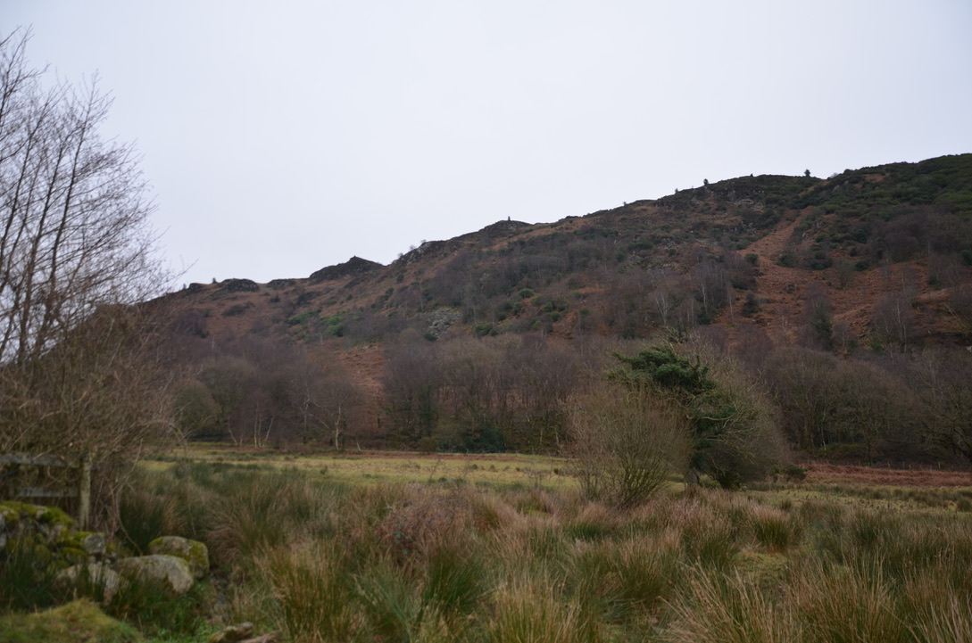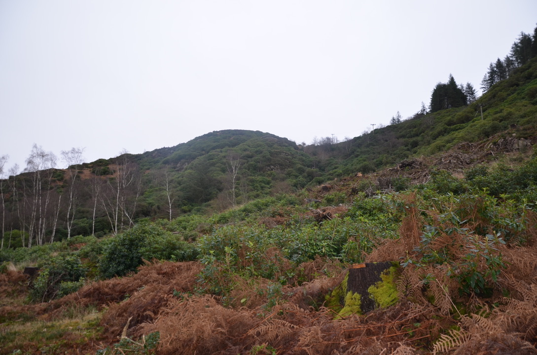 Nous avons continué un petit peu sur le sentier forestier avant d’arriver en bordure des collines de Muncaster. D’un côté du sentier, nous avions la petite forêt et de l’autre Muncaster Fell qui nous surplomblait. Le sentier commençait a être très boueux mais il était assez large et visible pour trouver la randonnée agréable. Le côté de Muncaster Fell est plein de rhododendron et nous nous sommes tous dit qu’il serait bien de revenir au printemps pour profiter de la floraison. (Nous allons essayer de nous rappeler de venir ce printemps).