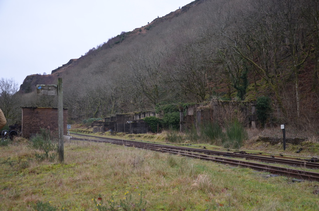 The path followed the railway line and Muncaster fell for a while before arriving at a point where we had to cross the line. We were now walking on the other side of the line with fields on one side and the railway line on the other. After stopping at Murthwaite Halt little stop and looking at the ruin of the old train station we entered a field with an open view on the Eskdale valley and distant summits.
